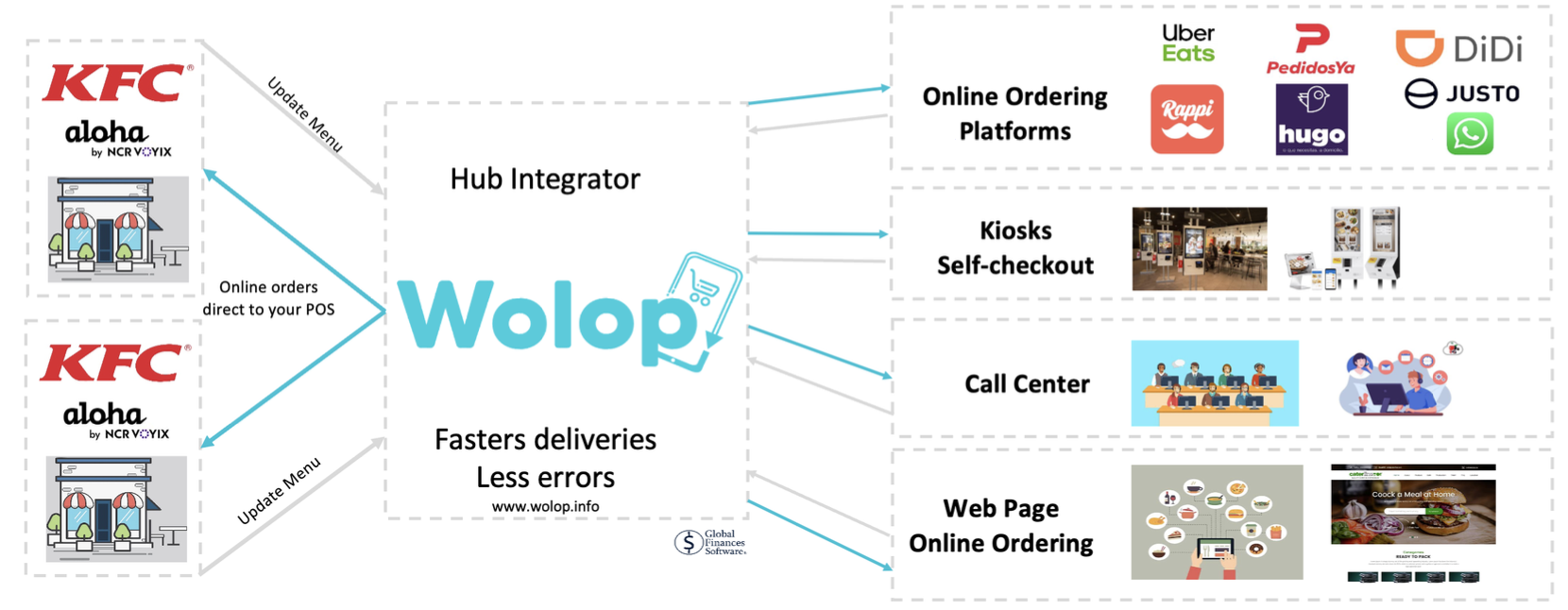 Robust technological ecosystem built to optimize restaurant operations. It simplifies online ordering, eliminates manual entry errors, and ensures all sales channels and loyalty programs are fully integrated with the restaurant’s POS system. Currently we are working with GF-POS by Global Finances, and Aloha by NCR Voyix.